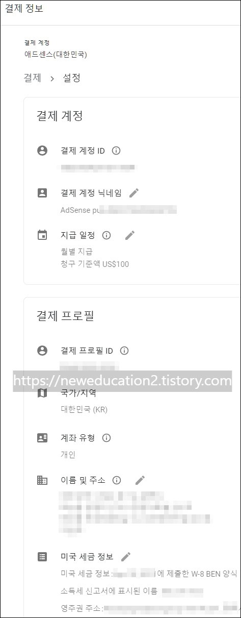 - 결제 계정 ID, 결제 계정 닉네임, 지급 일정, 월별 지급, 청구 기준액 100달러$, 국가와 시도 지역, 계좌 유형(개인), 이름 및 주소 수정 및 확인, 미국 세금정보(W-8 BEN), 영주권 주소, 소득세 세금 신고서에 표시된 이름/성함, 문서 언어 환경설정(한국어), 기본 연락처, 결제 서비스 사용자 관리