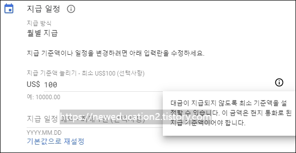 기본적으로 지급날짜는 변경이 불가능하고 지급을 보류해서 특정일에 지급을 받을 수는 있다고도 한다. 위는 구글의 지급에 관한 안내이다. 지급 일시는 매월 21일 전후인데 그 지급일은 일괄적으로 구글이 정했으므로 변경이 불가능하다. 지급될 최소 금액을 크게 잡으면 소액보다는 목돈을 1번에 받을 수 있다. 지급 일정을 변경할 수 없지만 대금이 지급되지 않도록 보류를 적용할 수 있다. 지금 처리일 이전에 보류 변경을 해야 이번 달 지급 주기에 적용된다.